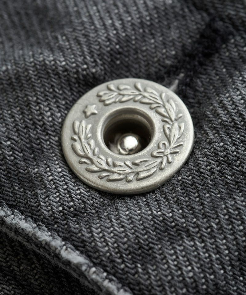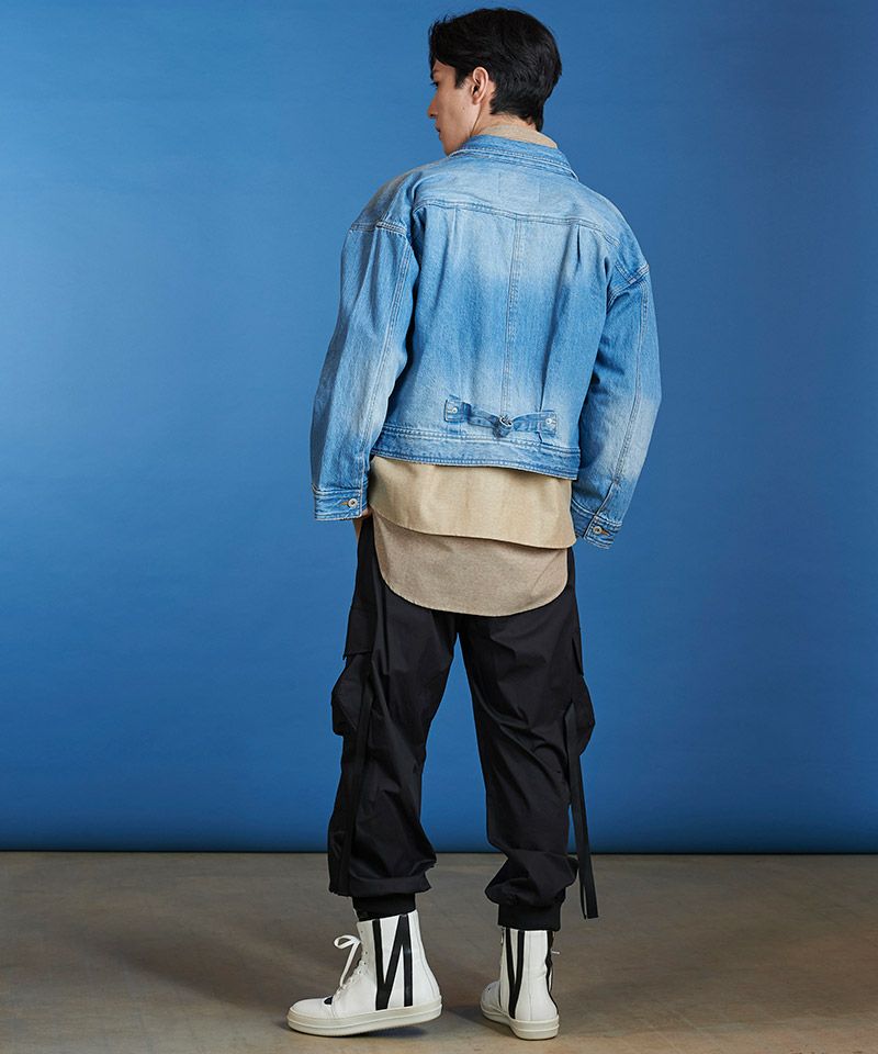 左胸のみ取り付けたフラップポケット、装飾的な役割の他にフロントボタンを締めて着用した時の可動域も確保してくれるフロントプリーツ、バックシンチと呼ばれるリベット補強されたバックルベルト、動きやすさを考慮した背面プリーツ、アルファベットの【T】の様に見える切替などヴィンテージデニムの要素をふんだんに取り入れた本格志向のデザイン。