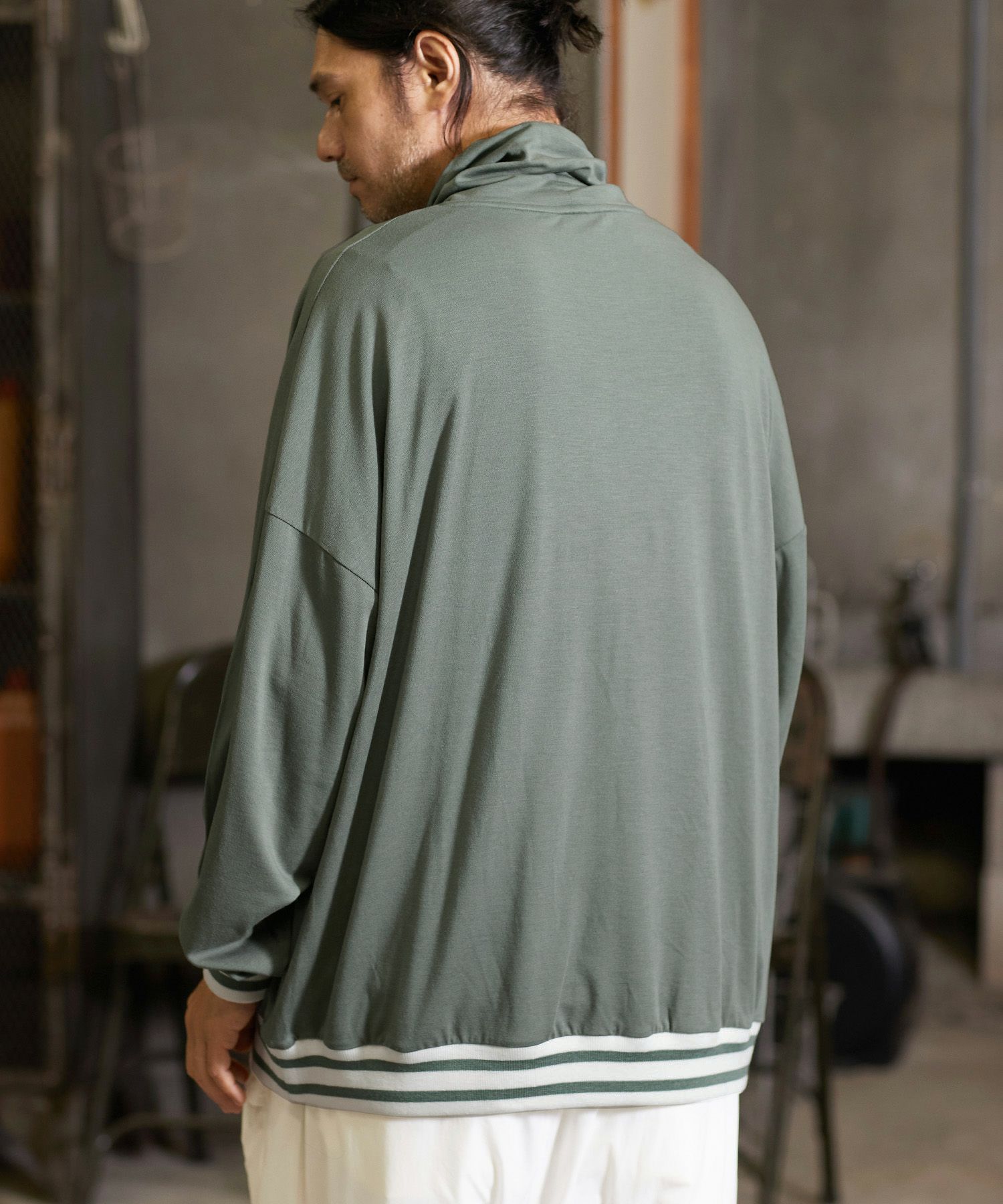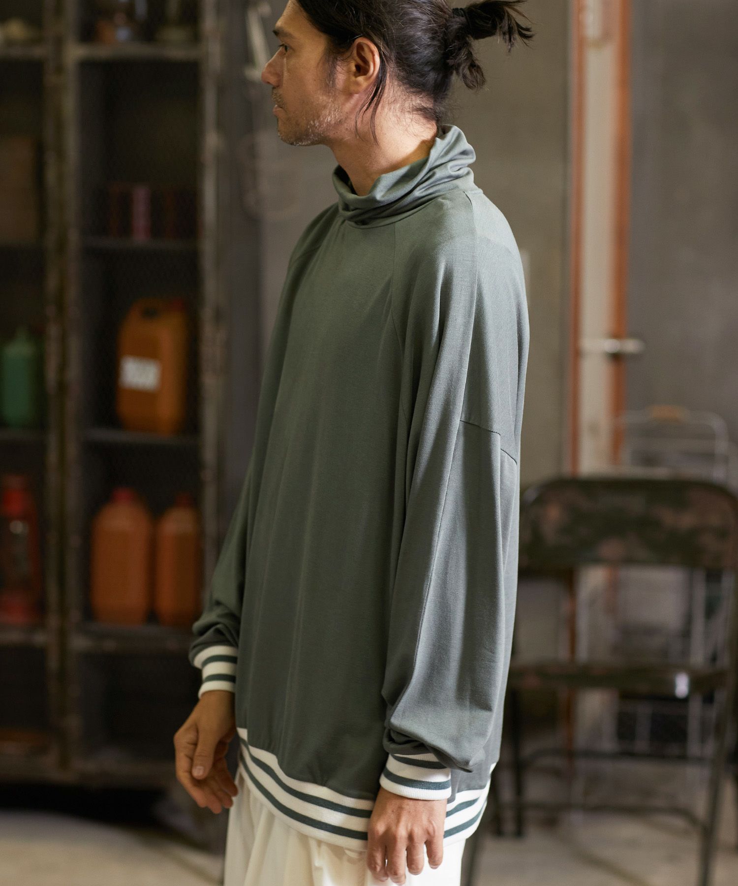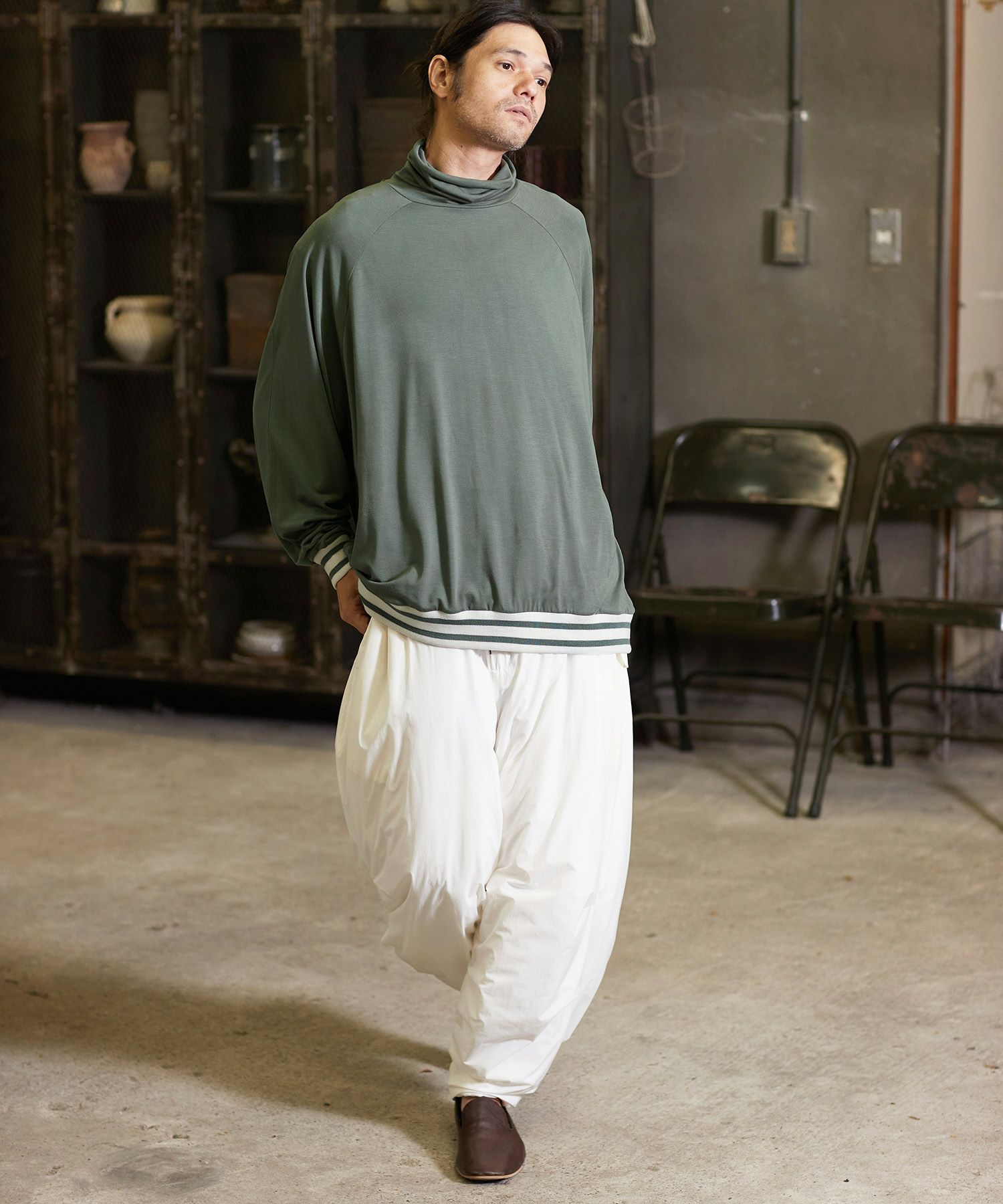 一見シンプルなデザインですが、袖と裾にオリジナル編み立てRIBを使用振り切ったオーバーサイズで、単体で着用しても雰囲気のある仕上がりです。
