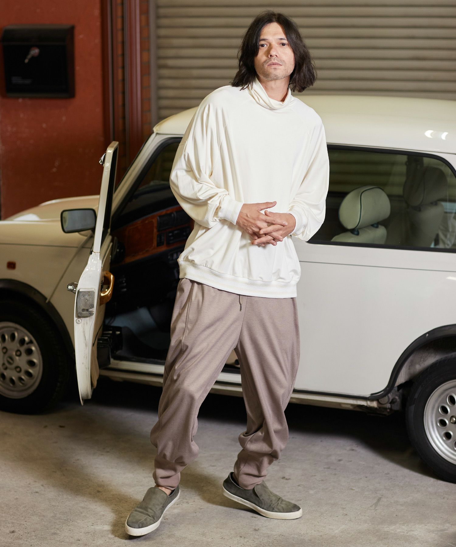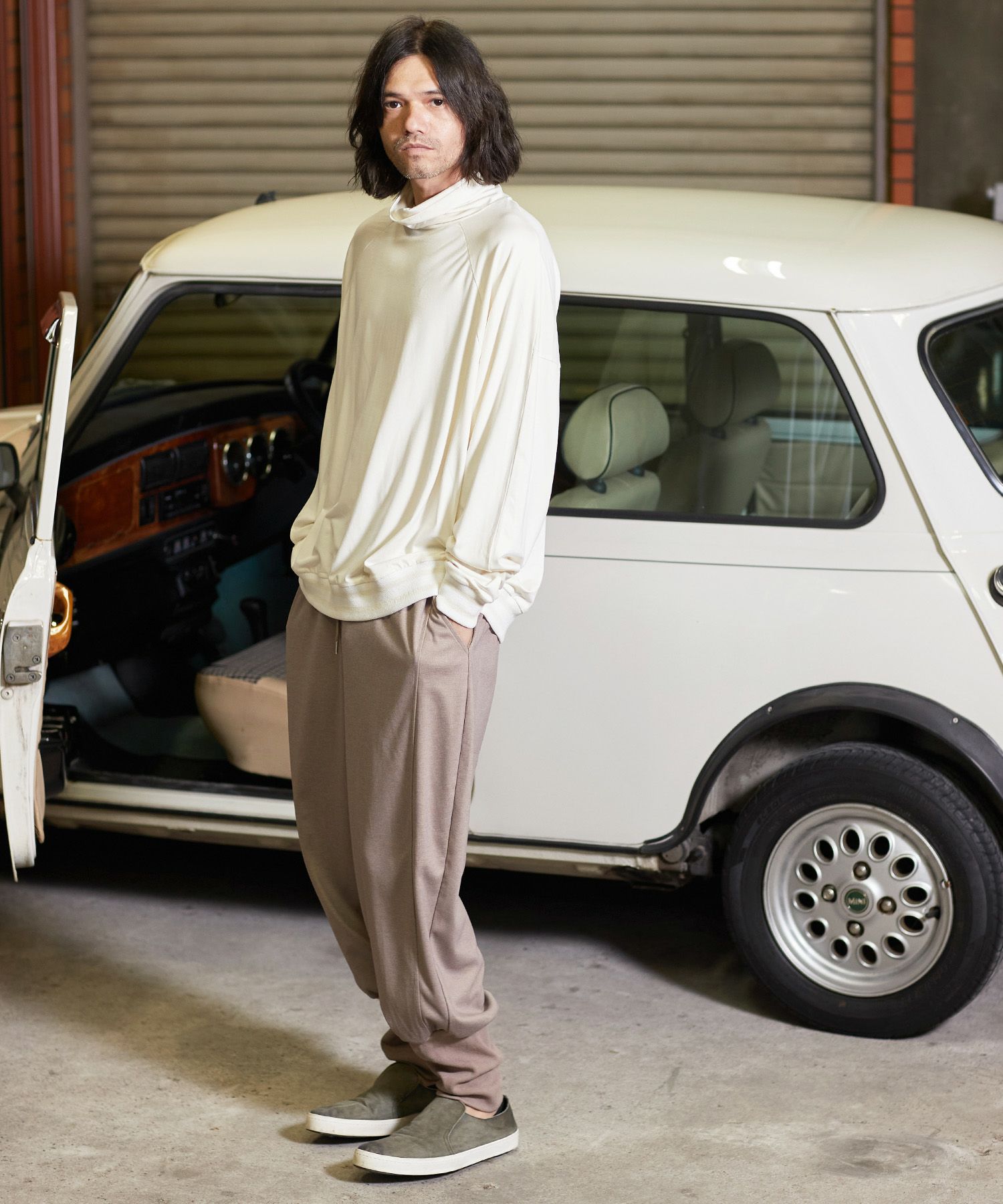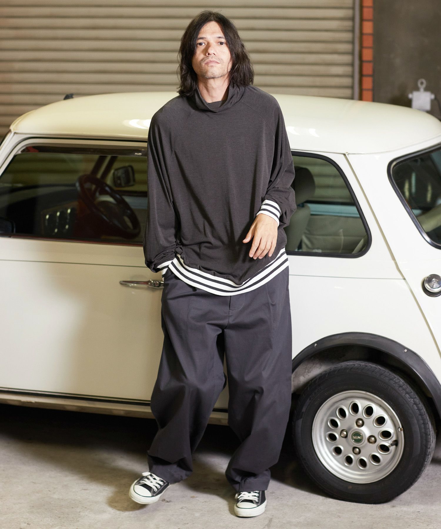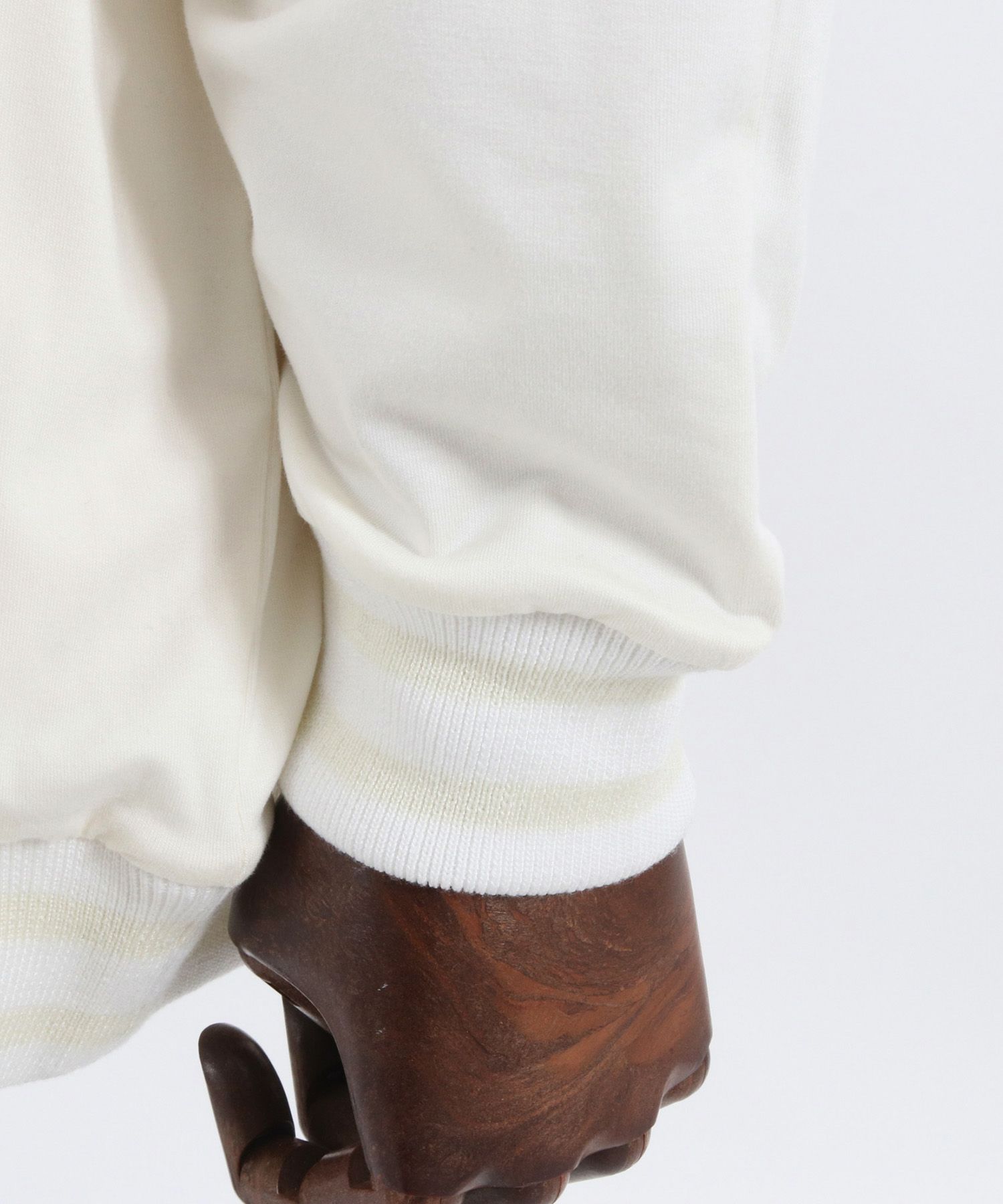 一見シンプルなデザインですが、袖と裾にオリジナル編み立てRIBを使用振り切ったオーバーサイズで、単体で着用しても雰囲気のある仕上がりです。
